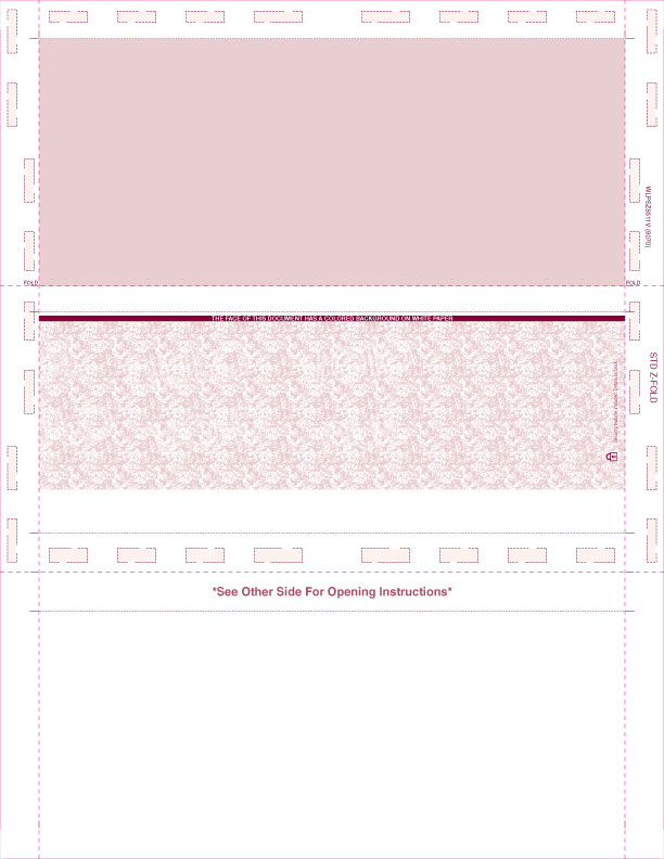 Z-Fold Pressure Seal Check Stock, Void Pantograph Burgundy - Quantity 2,500. Size is 8.5 by 11 inches. 24# paper.